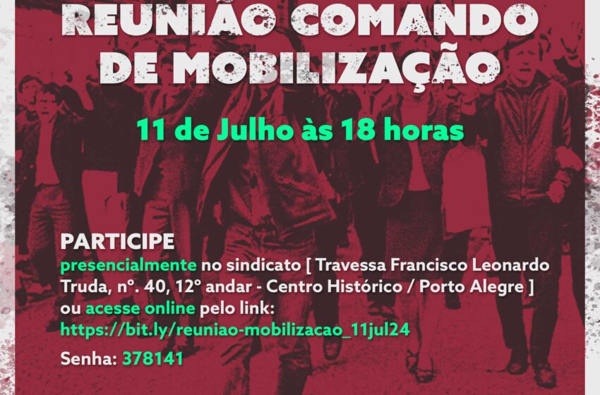 Reunião Comando de Mobilização Convocamos a todos para Reunião de Mobilização, a ser realizada na próxima terça-feira (09/07), às 18h, de forma híbrida. Participe presencialmente no Sindicato – Travessa Leonardo Truda, nº40 – 12º andar. Para a participação virtual será através do link: bit.ly/reuniao-mobilizacao_09jul24 Senha: 877470 Mobilização Já!Read More