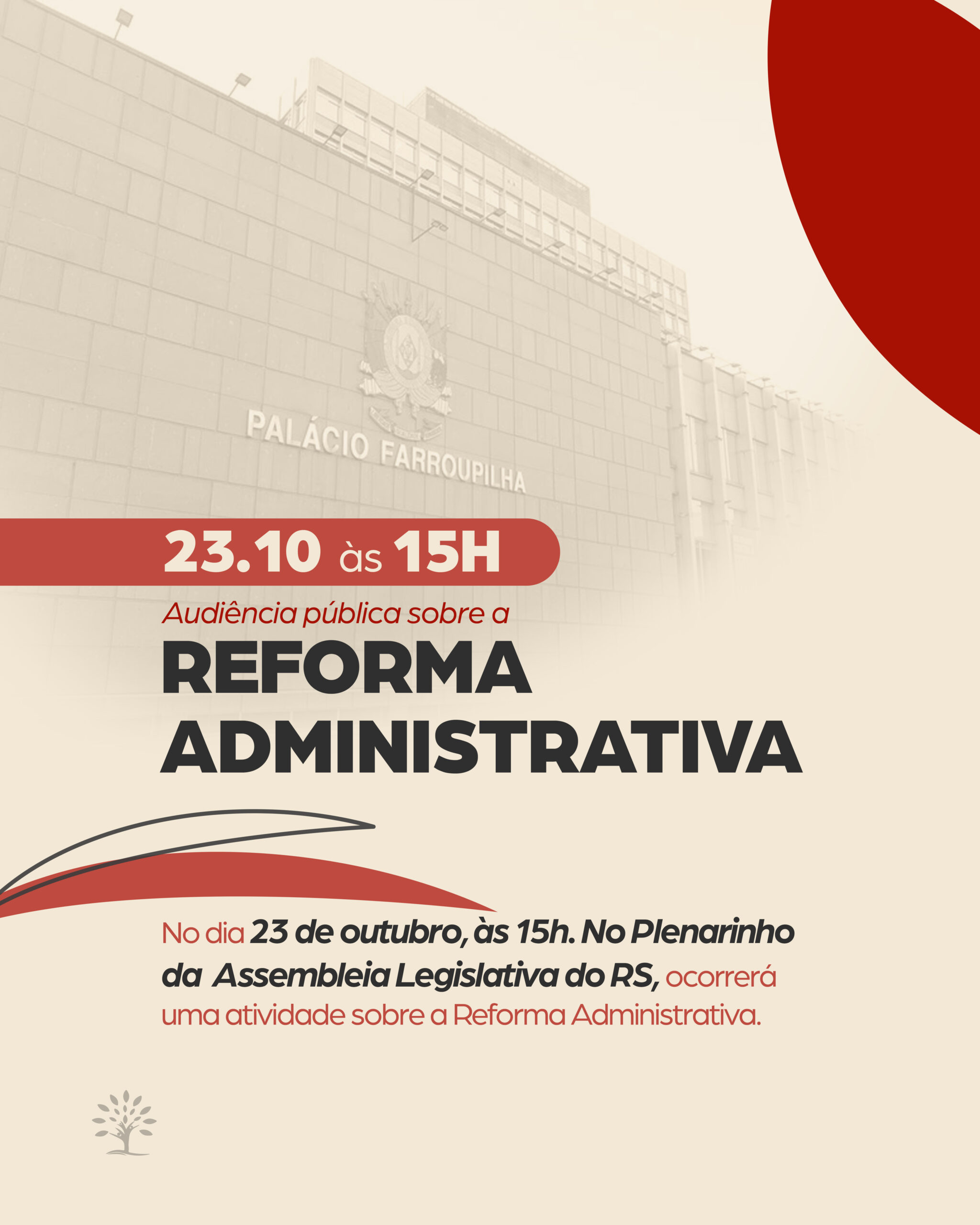 O SindisprevRS convida todos os servidores e servidoras, ativos e aposentados, a participarem da atividade sobre a Reforma Administrativa, que será realizada no Plenarinho da Assembleia Legislativa do Rio Grande do Sul, nesta quinta-feira, 23 de outubro, às 15h.