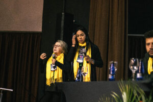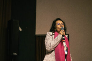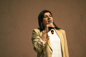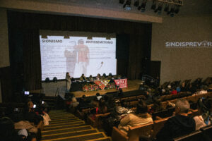 Marina explicou que o sionismo é uma ideologia política que busca a criação de um Estado Judeu. Sobre a situação em Gaza, a palestrante destacou que 70% das vítimas são mulheres e crianças, questionando a narrativa da grande mídia: “Será que isso é um conflito ou uma guerra? Não, isso é genocídio”, afirmou. Ela também ressaltou o número alarmante de 270 jornalistas mortos em Gaza, um total superior ao de todas as guerras mundiais juntas, e lembrou das mortes de profissionais de saúde.