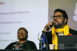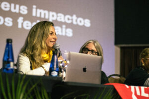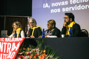 Em seguida, o congresso realizou a plenária “Saúde Mental: IA’s, novas tecnologias e seus impactos nos servidores públicos federais”, com a psicóloga Mayte Raya Amazarray e o também psicólogo Bruno Chapadeiro.