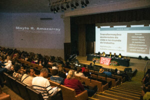 Mayte abordou as “transformações aceleradas da vida e no mundo do trabalho”, com foco na digitalização, nas inteligências artificiais e no trabalho remoto/híbrido. Ela usou como exemplo o caso de demissão em massa no Banco Itaú, que teria sido baseada na medição de cliques dos funcionários em teletrabalho, destacando a falta de registro real das “horas trabalhadas”. A psicóloga também pontuou os impactos na saúde mental, física e social que o isolamento causado por essas tecnologias pode trazer aos trabalhadores.