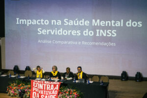 Bruno Chapadeiro, por sua vez, analisou os “Impactos na saúde mental dos servidores do INSS”, com base no Programa de Gestão de Desempenho (PGD). Ele destacou os efeitos negativos do PGD, como o aumento da pressão por produtividade, assédio institucional e a cobrança excessiva por metas. Como recomendações, Bruno sugeriu a revisão do PGD, a criação de um comitê para atender servidores em sofrimento psíquico, a suspensão de metas e a implementação de um programa de promoção à saúde mental.
