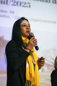O terceiro e último dia do XVIII Congresso Estadual do Sindisprevrs, realizado neste domingo (14), iniciou com a plenária “O genocídio na Palestina e seu impacto sobre mulheres e crianças”. A palestrante Marina El Hajjar Meneghel, vice-presidente do PSOL/RS e militante do Coletivo Alicerce, abordou o tema.