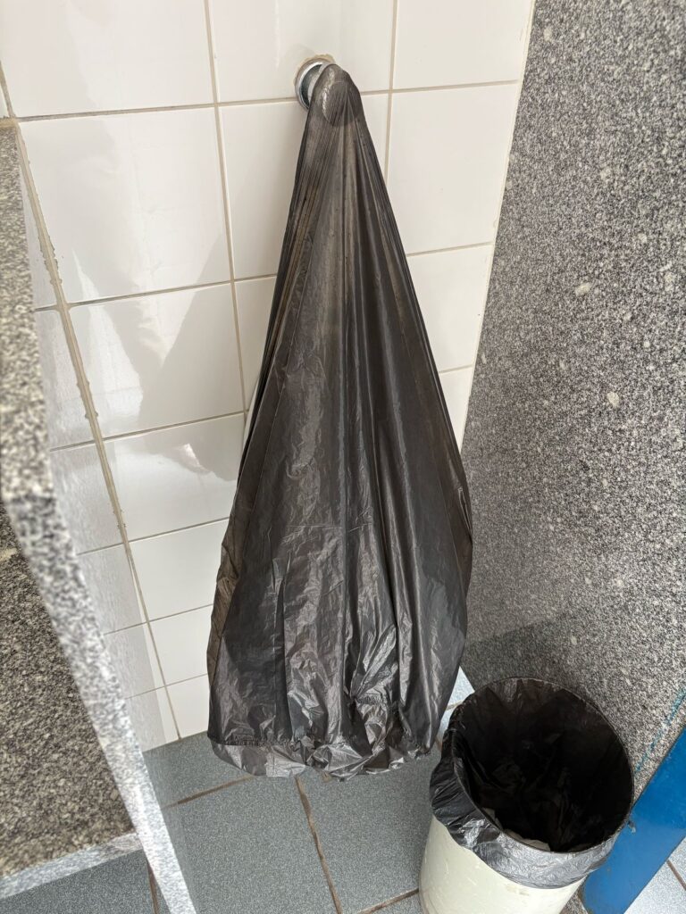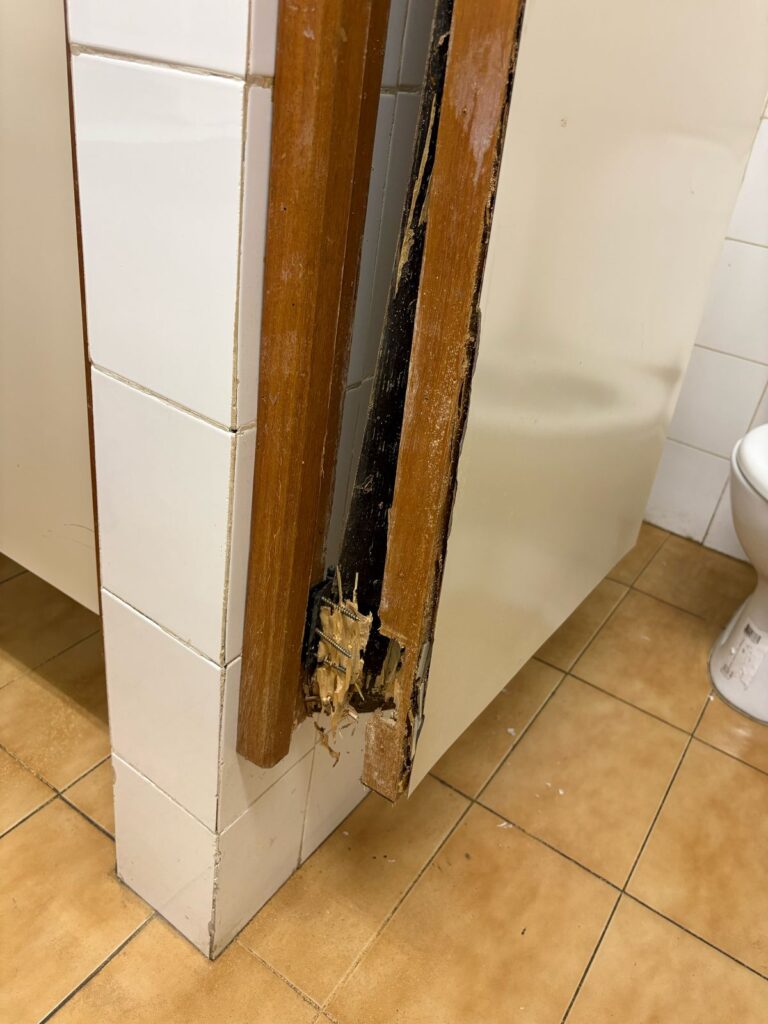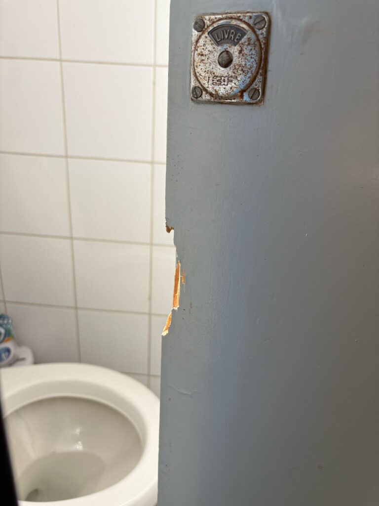 - O banheiro feminino tem dois vasos sanitários, sendo que apenas um funciona. O único em funcionamento está sem porta, causando constrangimento durante o uso, sendo necessário “vigiar” a porta principal do banheiro enquanto utilizado;