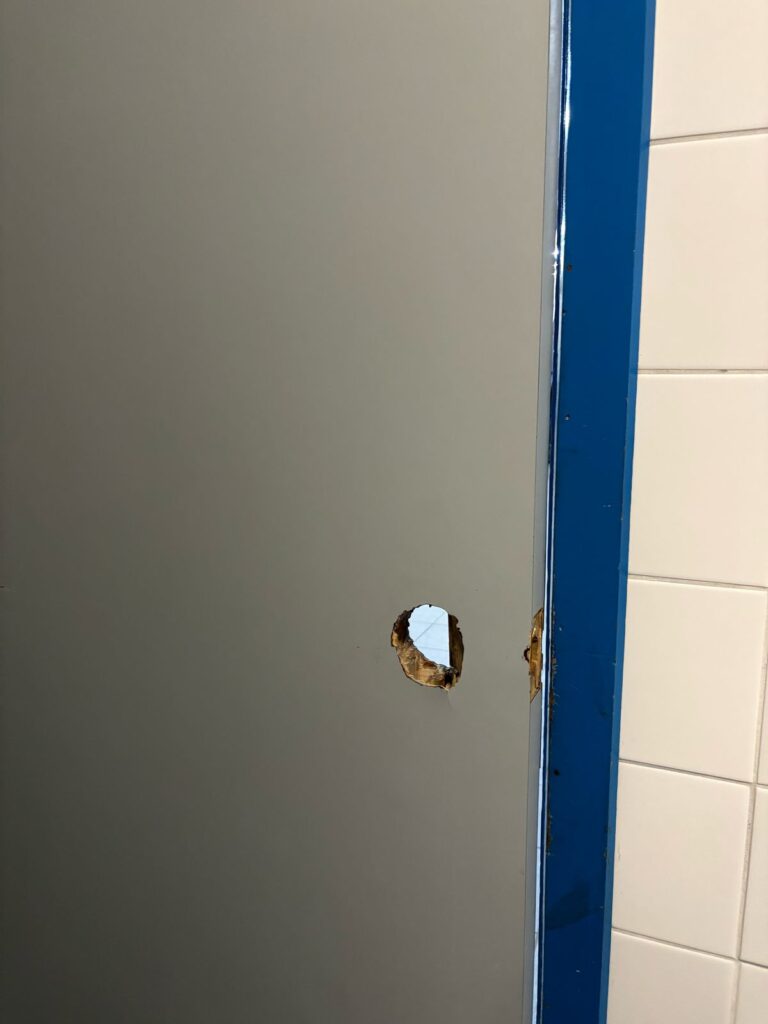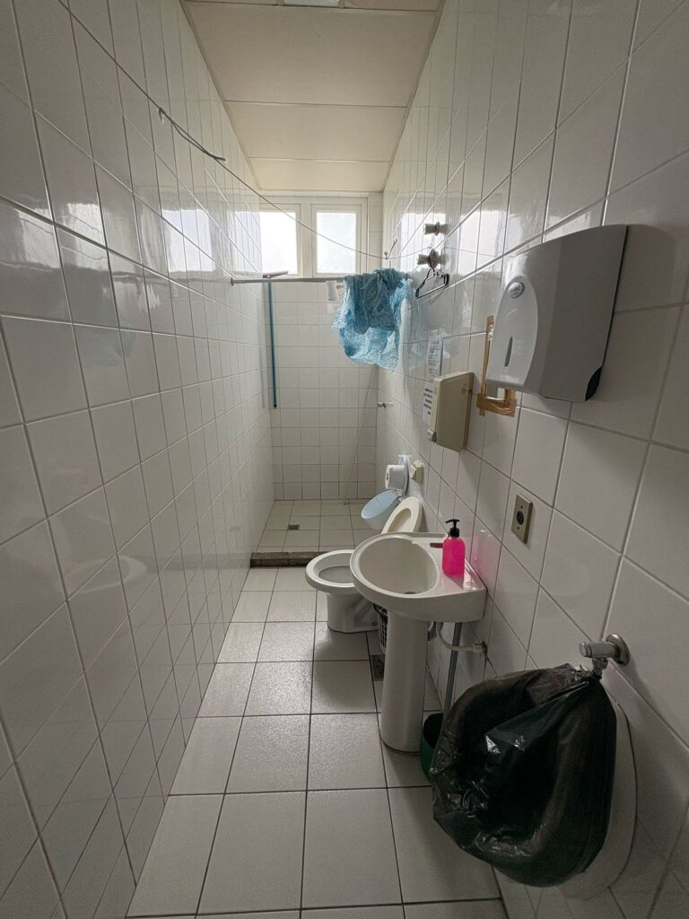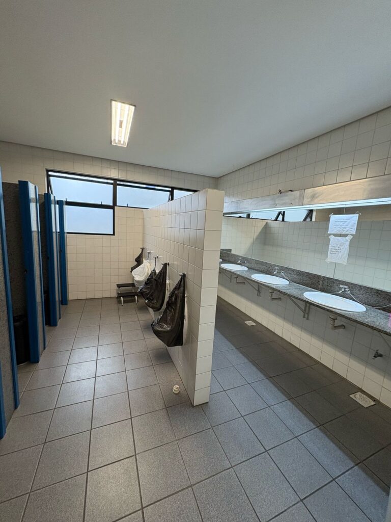 - Apesar de possuir 8 banheiros, todos estão com problemas de funcionamento, o que faz com que as pessoas tenham que “buscar qual vaso sanitário está funcionando no dia”, causando o compartilhamento de banheiros por homens e mulheres e como se fosse uma gincana todas as vezes que é necessário usar o banheiro;