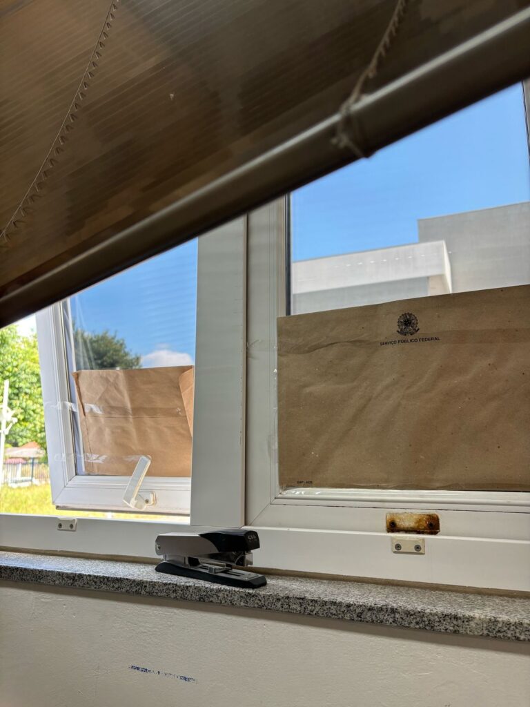 - Cadeiras em péssimo estado: muitas estão quebradas ou possuem consertos improvisados – gambiarras – feitos pelos próprios servidores. Há relatos de dores causadas pelo estado lastimável desses móveis e de rasgos nas roupas causados por partes danificadas das cadeiras;