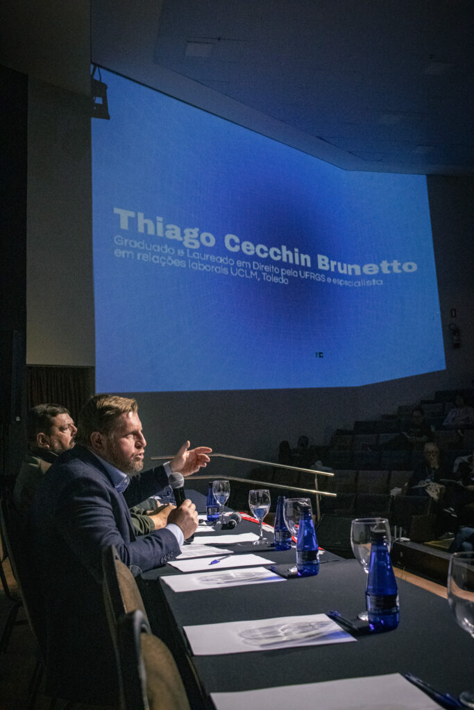 Na parte da tarde, a primeira plenária foi “Reforma Administrativa: os impactos na vida dos trabalhadores e aposentados do serviço público”, com a palestra do advogado Thiago Cecchini Brunetto e uma participação em vídeo do professor de sociologia, Ricardo Antunes.